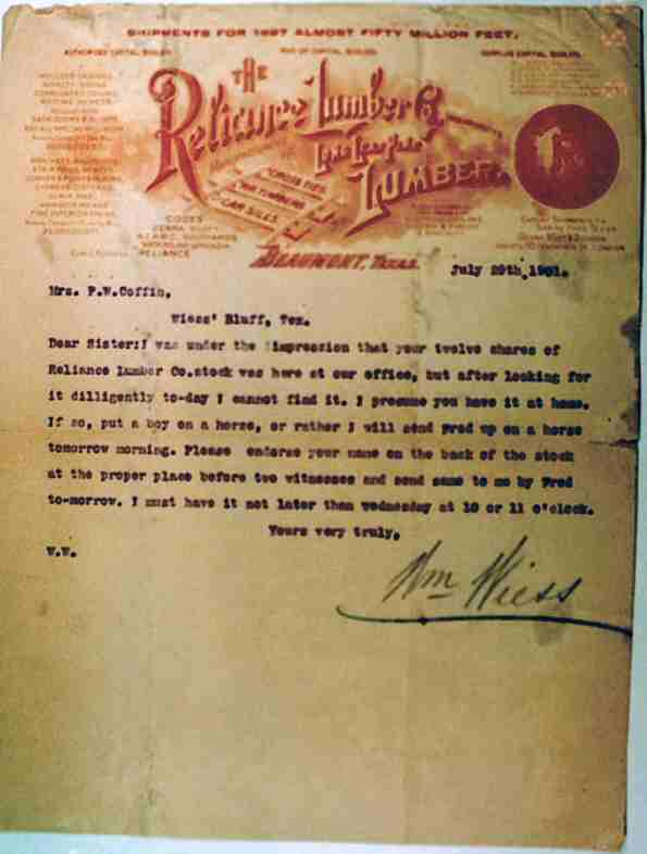 Beaumont’s Big BusinessGalveston Daily News, February 15, 1888 Reprint Compiled by W. T. Block(pub. Texas Gulf Historical & Biographical Record, Vol. XIII, No. 1, Nov. 1977, pp 84-90. W. T. Block, editor--scanning and web conversion by Mr. Tom Cloud) I reached this great saw mill city and lumber mart yesterday [February 10, 1888] and found that the drought had not visited the County of Jefferson recently. The rich black mud, that allowed the wagons to go down half-way to the hubs, told of the probabilities of the land if only tickled by the hoe. In my sauntering I brought up face to face with Mr. Mark Wiess, whose countenance wears a perpetual smile. He suggested that we visit the mills, and we started out by first exploring the intricacies of the great Reliance mill, one of the best managed mills this side of Michigan. Upon first entering the building my astonished gaze met such a whirl of machinery that I could hardly make up my mind that I had not discovered Dante’s dark region, and looked for the warning: “He that enters here leaves hope behind.” Mr. Wiess led me safely through, but I was right glad to be able to inventory as many arms and legs at the end as when we started. This mill is owned by the Wiess Brothers and Mr. H. W. Potter, all of whom are known to every lumber dealer this side of the Great Lakes. Its capacity is 20,000,000 feet a year. They have a Reynolds-Corliss engine, diameter twenty-two inches, stroke forty-two inches, and a sixteen foot driving wheel, thirty-one inch face, and is claimed to be one of the finest and best pieces of work ever put in a mill. The saw mill is a double rotary, with improved steam feed, powerful ‘steam nigger’ for turning logs, live rollers, edgers, trimmers, sizer, and automatic slab chain that dumps the waste across a wide bayou into a heap where it is burned. E. P. Allis and Co. of Milwaukee constructed all except the slab chain, and no manufacturer claims to lead them in modem improvements on engines or sawmills. Four steam boilers, each 42 inches in diameter, by 26 feet in length, with two 16-inch flues, supply abundant steam to run this great pile of machinery, enabling them to give quick delivery on all orders. They are now furnishing large quantities of construction material to the Fort Worth and Denver, Houston and Texas Central, Mexican National, Missouri Pacific, and Southern Pacific railroads. Their planning mill can dress 75,000 feet per day, while their dryer will thoroughly season 20,000 feet of inch boards every twenty-four hours. They also run a manufactory, where they manufacture large quantities of doors, sash, stair rails, balusters, handsome office desks, tables, etc. They also make a specialty of Bagdad [picket] fence that is now being much sought after. They have boomage for 10,000,000 feet of logs and own 20,000 acres of the finest long leaf pine lands. Mr. William Wiess is general superintendent and Mr. V. Wiess financier. They are putting in a fine system of waterworks which ought to reduce their insurance, They are running a four-inch water main to every part of the mill, yards, and planer, with ten double-hosed hydrants and this, with an abundance of hose should place the risk at the lowest minimum. The interior of their office is a marvel of beauty. It is finished up with native woods, and plainly suggests to the coming architect that when he goes beyond the borders of own state for fine grained or lovely faces in lumber to give rich effect, it is a clear case of pure ignorance. Had those lawyers at Austin, who debated so long about the finish to be used in the capitol, only visited this piece of work, the people’s money would have been more wisely invested, all apprehension dismissed, and the critics silenced. To Mr. W. A. Priddie, the secretary, and to Mr. A. DeHebecourt, bookkeeper, we are indebted for sundry courtesies. The Beaumont Lumber Company is composed of fresh, young, Texas-raised blood, and proves to mankind that it is well to grow up in a new country. F. L. Carroll, president, G. W. Carroll, vice president, and John Gilbert, secretary and treasurer, are the officers, all raised here, and men better versed in their business are nowhere to be found. They know how to gain customers and how to hold them. There is a streak of Quaker blood in them, and no man questions their integrity. Their mill has a capacity of 60,000 feet per day, and their planer can put through 50,000 feet in the same time. They are always on the alert for anything new in machinery that will enhance the value of their lumber or reduce the expense of making it, and they aim more at giving the very best quality of lumber to their customers than to announcing big dividends to the stockholders. On this foundation they have raised a character that sells their product as fast as they can ship it. They sold 35,000,000 feet last year, and more would have been sold had the railroads provided transportation. With never less than 5,000,000 feet of dry stock on hand, dealers may safely rely upon prompt dispatch of all orders. They make pickets and moldings equal to the best made anywhere of all kinds. Owning a large line of railroad fully-equipped and landing their .logs in tide water daily, they are prepared to take orders for dimension lengths cut and ship same the year round, on shorter notice than any mill not similarly provided. They have a paid up capital of $239,000. Two of Prescott’s steam feeders are en route from the factory for their mills, which, added to their present capacity, will largely increase their facilities, They only cut long leaf pine and cypress, and the value of both is attested to by the eagerness with which the various railroads take up all that can be utilized in their work. Their business is increasing year by year, and as it has outgrown its old quarters and greater conveniences are demanded for offices and for the extensive mercantile interests of the firm, they have just contracted for the con