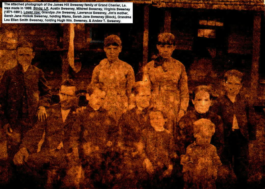 Sarah Jane Sweeney's parents were James Hill Sweeney (b. Grand Chenier September 22, 1849-d. there October 7, 1891) and Lou Ellen Smith (b. Brandon, MS January 10, 1847-d. Nederland, TX June 12, 1922). The following thumbnail photo of the James Hill Sweeney family was faded so badly that almost no detail was visible. While still very grainy, digital enhancement was able to bring out some facial details. Click on the thumbnail to see a full size image: Standing: Austin Sweeney, Mildred Sweeney, Virginia Sweeney (1871-1891) |
